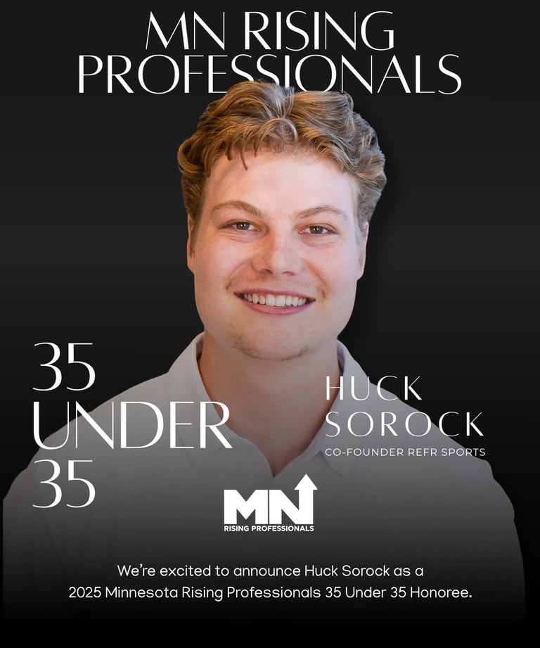 Huck the Co-Founder & CEO of Refr Sports, a platform transforming referee management in the sports world. Their mobile app connects referees, game organizers, and assignors, streamlining scheduling, payments, and communication while creating a gig-economy style marketplace for officials. By modernizing outdated systems, they are helping sustain and grow sports at all levels while providing financial flexibility and opportunity for referees. Huck and Wyatt’s innovation, dedication, and commitment to improving the officiating industry highlight their leadership and impact in the Twin Cities community.